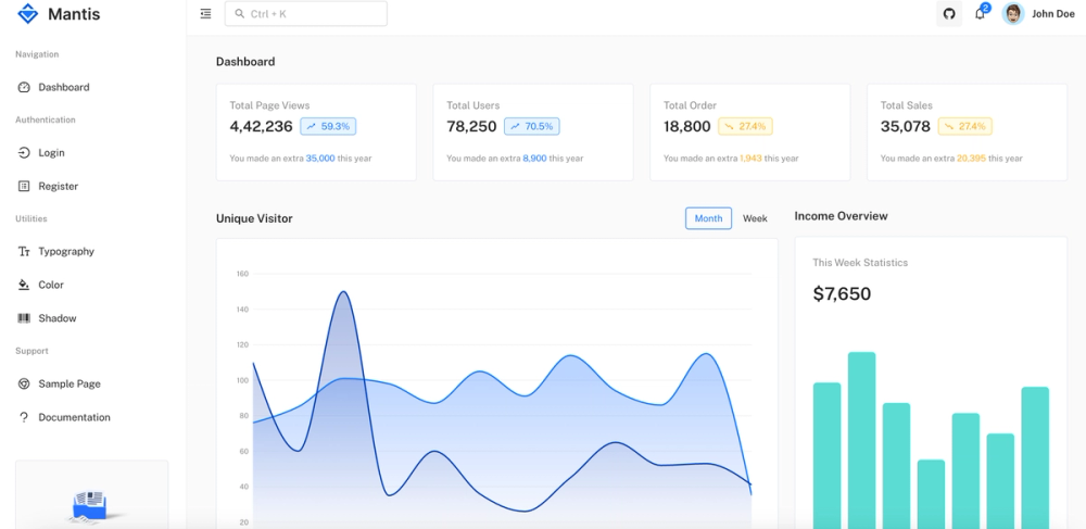 Mantis is a free React dashboard template using Material UI and Ant Design principles for flexibility and customizability.